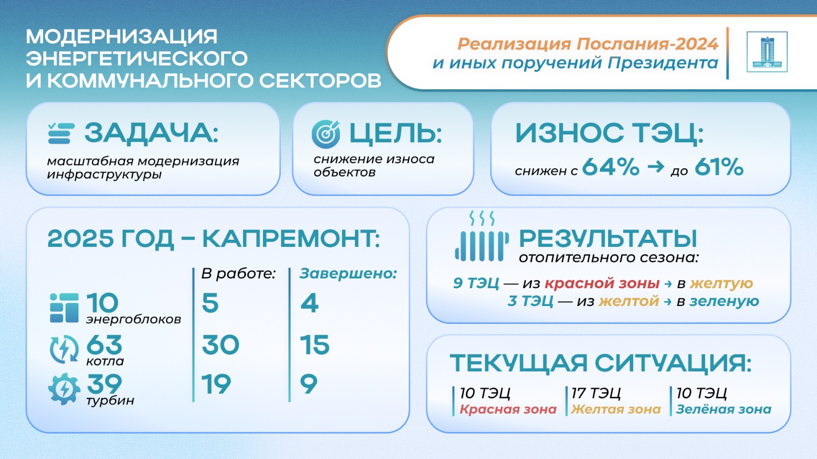 Вопросы снижения износа ТЭЦ на особом контроле Правительства. Реализуется масштабная ремонтная кампания: в 2025 году запланирован капитальный ремонт 10 энергоблоков, 63 котлов и 39 турбин.На текущий момент ведутся работы на 5 энергоблоках, 30 котлах и 19 турбинах. Завершен ремонт 4 энергоблоков, 15 котлов и 9 турбин. Проводимые меры уже дают ощутимый результат: средний износ ТЭЦ по стране снижен с 64% до 61% благодаря модернизации и обновлению оборудования.