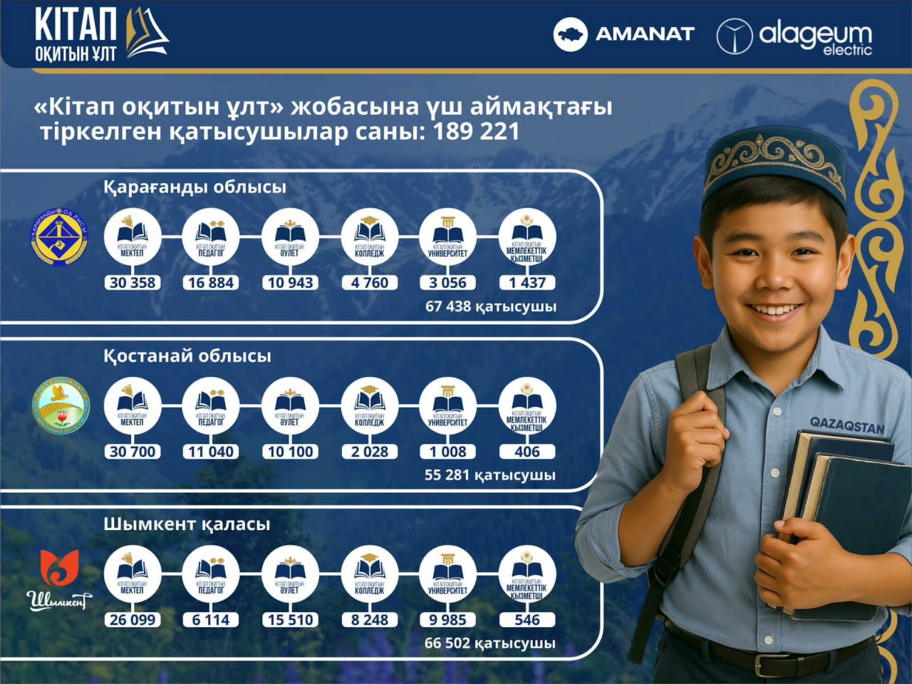 Оның ішінде 6-10 сынып аралығындағы 87 157 оқушы, 14 049 педагог, 2388 жергілікті деңгейдегі мемлекеттік қызметші, сонымен қатар 36 553 отбасы, 29 085 колледж және жоғарғы оқу орны студенті қатысуда.