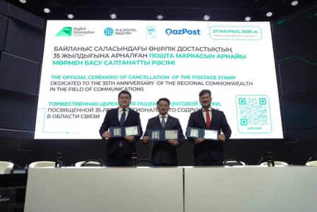 Шымкентте өтіп жатқан Digital Qazaqstan 2026 халықаралық форумы аясында Байланыс саласындағы өңірлік достастықтың (БӨД) 35 жылдығына арналған жаңа пошта маркасының салтанатты таңба қою рәсімі өтті.
